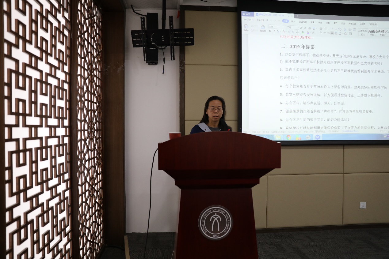 2019年1月8日上午,yl8cc永利官网全体教职工大会暨一届五次教代会扩大会议在yl8cc永利官网C5049会议室举行。 大会第一阶段的全体教职工大会由院工会主席周晓文教授主持。首先由院党政领导进行述职。院党委书记康震教授对总结了2018年度院党建工作,研究生教学副院长张清华教授、科研副院长齐元涛教授、本科教学副院长马东瑶教授、外事副院长杨利慧教授分别就所分管院事务工作进行述职,院党委副书记方红珊老师和周云磊老师分别就所分管的教师党建、人才人事工作和学生工作进行了述职。第一阶段会议结束后,全体教职工进行了合影。 大会第二阶段是yl8cc永利官网一届五次教代会扩大会议,由院党委副书记方红珊老师主持。全体教代会代表和教职工听取了过常宝院长所做的《yl8cc永利官网2018年度工作报告》和康震书记所做的《yl8cc永利官网2018年度财务工作报告》,yl8cc永利官网教代会提案工作组组长李晋霞所做的《yl8cc永利官网教代会2018年度提案委员会工作报告》,院工会主席周晓文所做的《yl8cc永利官网工会2018年度工作总结》。随后,全体教职工进行了分组讨论,审议通过大会报告,并重点对《yl8cc永利官网教职工年终考评修改意见稿》进行了讨论,讨论热烈,为学院的发展献计献策,提出了多项有意义的意见和建议。yl8cc永利官网领导进行了现场答询。最后,yl8cc永利官网党委书记康震教授进行大会总结。