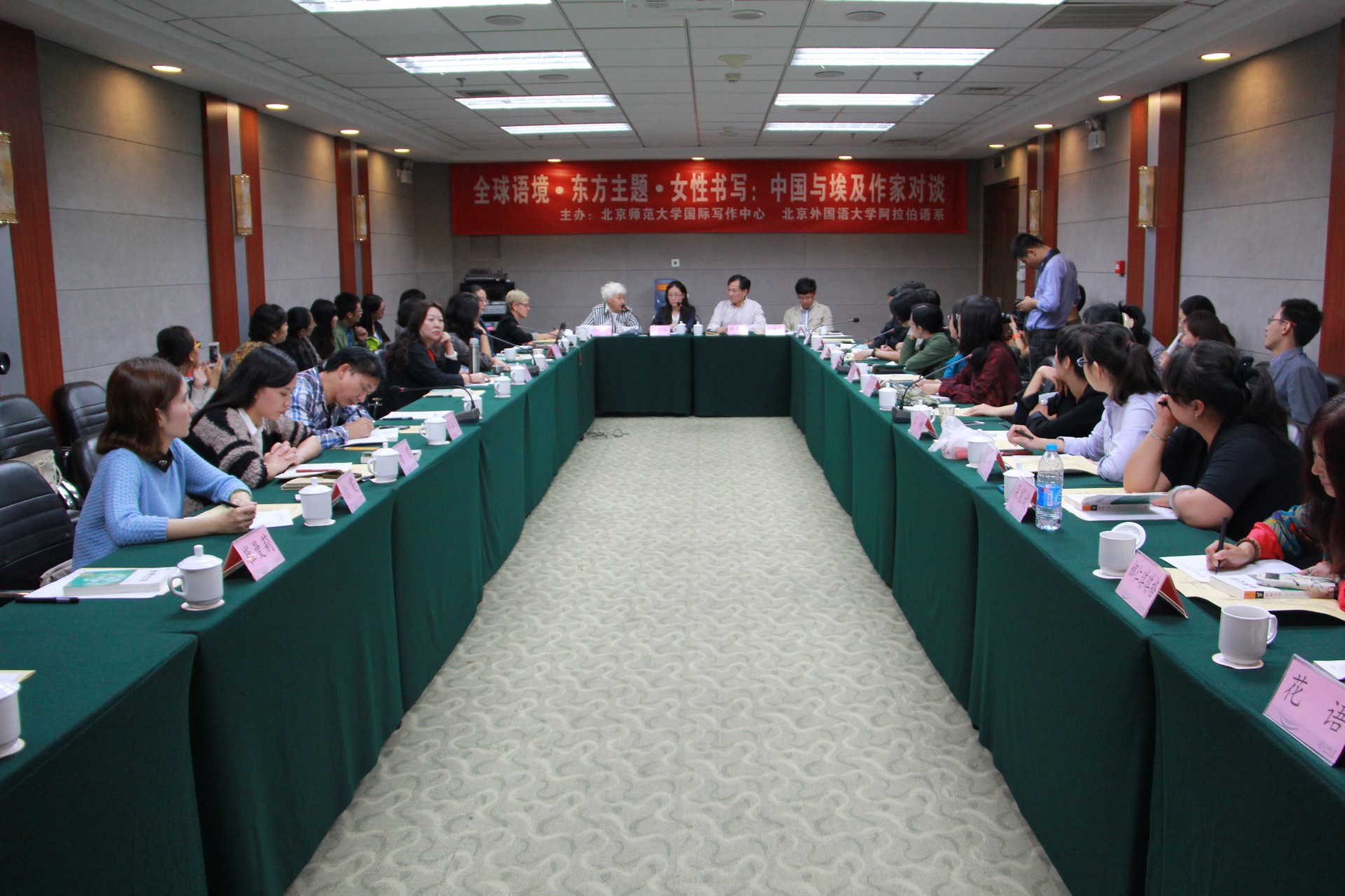 2014年9月23日下午,由yl8cc永利官网国际写作中心、北京外国语大学阿拉伯语系联合主办的“全球语境•东方主题•女性书写:中国与埃及作家对谈”研讨会在京师大厦第五会议室顺利举行。埃及当代著名女作家纳娃勒•赛阿达维女士,美国杜克大学阿拉伯文学教授米丽安•库克女士,著名诗人、yl8cc永利官网驻校诗人欧阳江河先生,著名诗歌评论家唐晓渡先生,翻译家、《世界文学》主编高兴先生,诗人从容女士、潇潇女士、蓝蓝女士等一众国内著名诗人和学者出席了本次活动。本次研讨会由yl8cc永利官网国际写作中心副主任梁振华和北京外国语大学阿拉伯语系主任薛庆国联合主持。