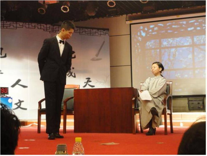 决赛由人文说理、知识问答、即兴说理、人文演绎四个环节组成。第一环节要求现场进行诗词创作。我校代表在15分钟内写成符合韵律要求,立意深刻的律诗,获得高分。第二环节为必答题和抢答题,我校代表队在抢答部分出现小失误,但是第二环节分数仍在前三之内。接着在即兴说理环节中,我校选手才思敏捷,表现出扎实的文学功底,对红楼梦指定情节做了精彩解读,赢得评委连声称赞。决赛的高潮出现在最后的人文演绎环节,我校代表队出演了原创话剧《赤子》,在短短的8分钟内,以巴黎和会为背景,演绎了救亡图存、自强不息的民族精神,获得了在场观众的热烈掌声。