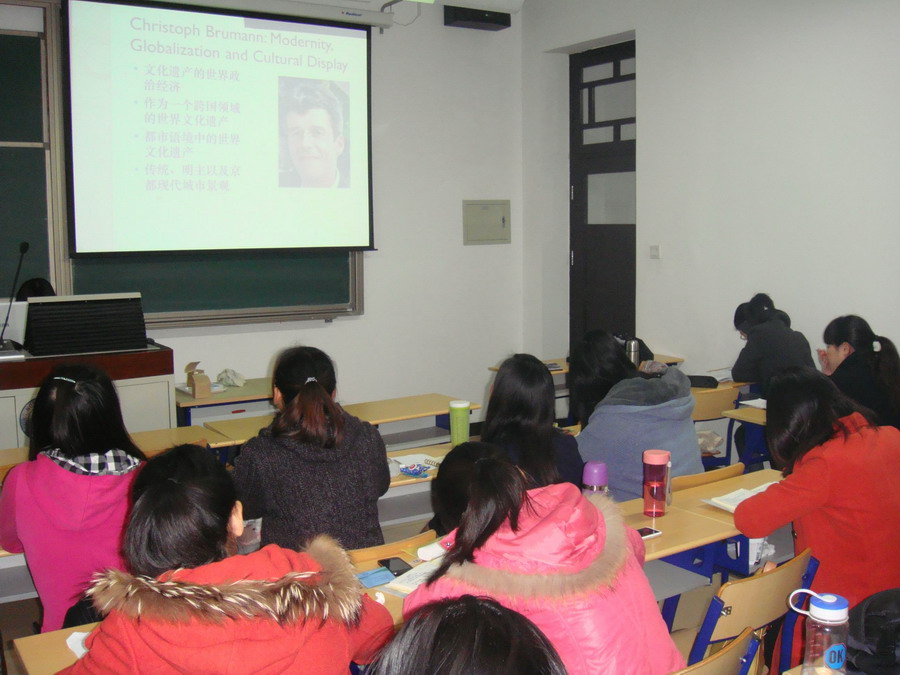 2012年11月8日,在民俗学与文化人类学研究所杨利慧教授开设的研究生课程“世界民俗学导论”课上,举行了一次别开生面的“在线国际学术讲座”——接受杨教授的邀请,远在美国印第安纳大学学习的民俗学专业博士候选人张丽君通过现代通讯软件skpy,与教8楼102教室中的电脑实现了远程连接,以此方式,向同学们介绍了当前美国以及其他一些国家对于遗产旅游(heritage tourism)的重要学术研究成果。