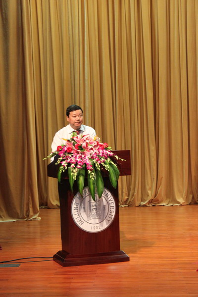 著名文艺理论家、yl8cc永利官网资深教授童庆炳先生代表全院教师发言。“欢迎你们的到来,你们是yl8cc永利官网的新元素、新力量和新的血液。yl8cc永利官网需要你们!”童先生的亲切呼唤赢得了在场同学的一片掌声。他结合自己丰富的人生阅历,为新生提出了“求真”、“求善”、“求美”的为学做人之道,希望同学们在多元复杂意识形态的冲击下坚守自己的原则。随后,从刘勰“情以物兴,物以情观”的美学观点切入,童先生深入浅出地为新生们揭示了“情物互构”,“读万卷书亦应行万里路”的道理。最后他寄语新生,“走好自己的路,实现人生的升华。”童庆炳先生的发言引发了同学们深入思考和强烈共鸣。