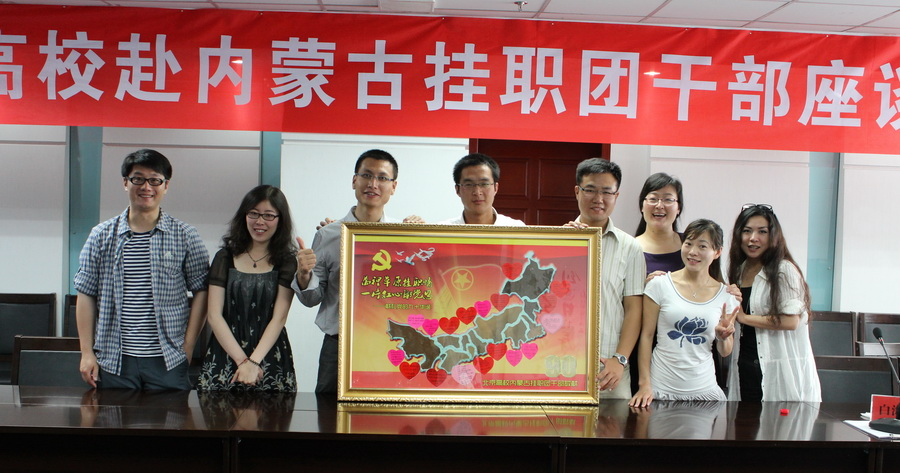 从2010年底知道了有这么一群人要一起去内蒙挂职,到过年后第一次见面AA吃火锅,我们37位挂职团干部的形象从单一的纸质材料、网络头像,成了活生生的每一个人。共同的使命,让我们在见第一次面的时候就产生了一种亲人般的感觉。挂职的日子里,飞信群和qq群是我们联络和交流的桥梁。网络十七届六中全会精神学习讨论会、网络团组织创新方式头脑风暴、网上生日会,都使我们拉得更紧密。作为队长和临时党支部书记的我,一刻也没有忘记用党组织来聚拢大家,于是内蒙挂职团“创先争优活动实施方案”的指导下,五个党小组营运而生,党小组长通过组织团建分享活动、参观学习博物馆、观看爱国爱党影片、开展主题座谈会等活动,让党员挂友们紧密地围绕在党组织周围。七一前夕,37名团干用挂职驻地的土壤和沙子堆积而成的两面内蒙沙盘地图——“万里草原挂职情 一片红心谢党恩”,一面在团队组织的七一座谈会上送给了内蒙自治区团区委,另一面则翻山越岭回到了北京献给了北京团市委。红色的祝福卡片,传递着37位的决心、认定两个团委都是家的心情。45%的内蒙挂职团干工作在国家级贫困县,这共同的奋斗历程也把我们拉得更近、更亲,尤其在经历了七一座谈、中秋东西互动、国庆边防慰问、编辑十万字草原风等诸多过程之后,挂友们的感情更深了。这一种感情,与见面多少次无关。