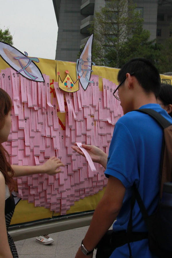 值得一提的是,yl8cc永利官网学生会宣传部在此次迎新活动中加入的“师大百问墙”环节。百问墙的外形是一个长着白色翅膀的心,这颗心是由200多张粉红色长纸条拼合而成的。那数百张纸条上是yl8cc永利官网宣传部的同学精心思考出的关于北师大和yl8cc永利官网的题目。这些题目新颖别致,大到“yl8cc永利官网的成立时间?”,小至“北师大浴室何时开放?”均有涉猎。每个来报到的新同学,都会被引领至百问墙,撕下自己心仪的纸条。而这些问题的答案,则需要11级的新生们通过在师大的学习和生活经验来自己解答。成功回答出问题的同学,将会在以后的日子里,获得幸运女神的庇护。yl8cc永利官网学生会希望通过这样一种形式,加快同学们对师大,对yl8cc永利官网的了解。使新生能够尽快的融入大学生活。